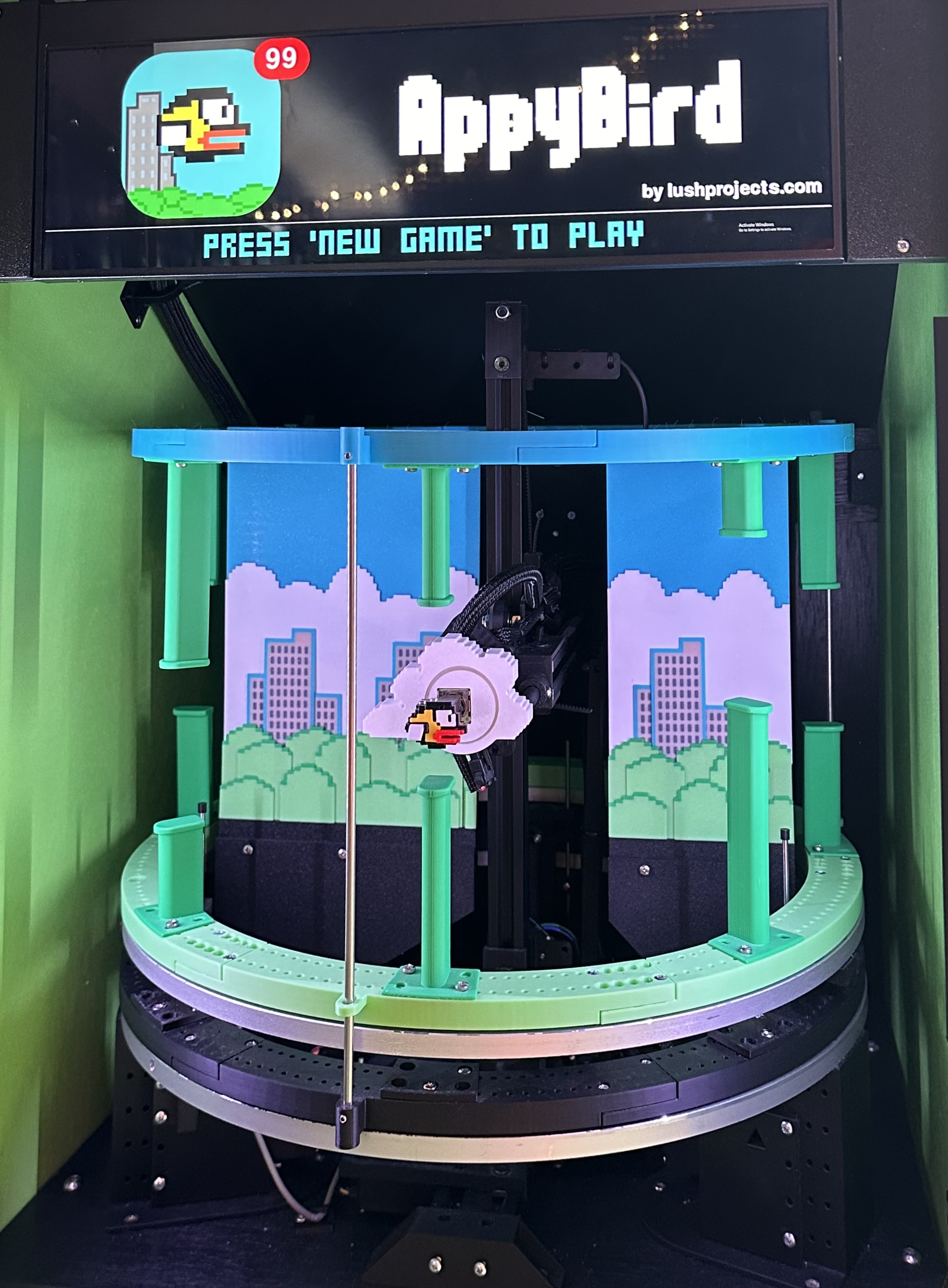 The final machines plays really well, and looks great. It was launched at EMF Camp 2024 where it got over 5000 plays and 160,000 flaps over the weekend. For a first outing it was super reliable. There were only two restarts due to software problems. The biggest problem was a servo in the height control that died on Friday night - allowing a bunch of kids to set silly high-scores as the machine was effectively stuck at level 2. Fortunately I had seen a similar servo failure in testing, so brought a spare set. Doing the rebuild in a tent at 10pm wasn't ideal though!