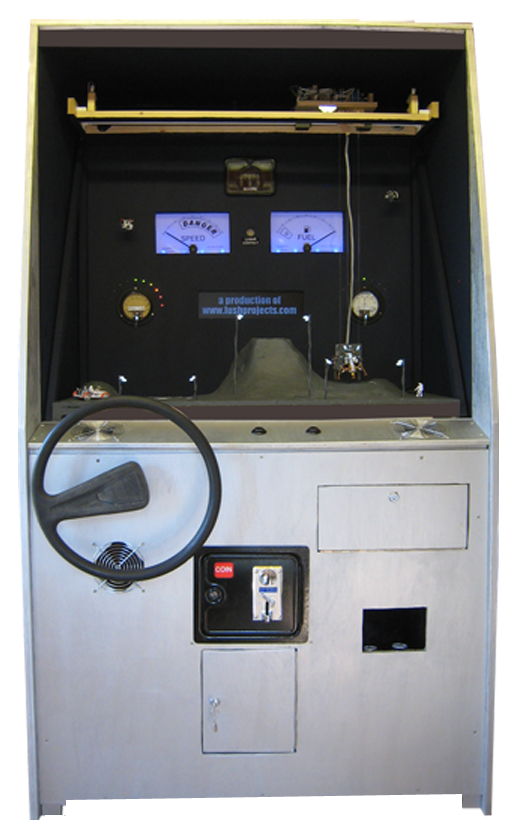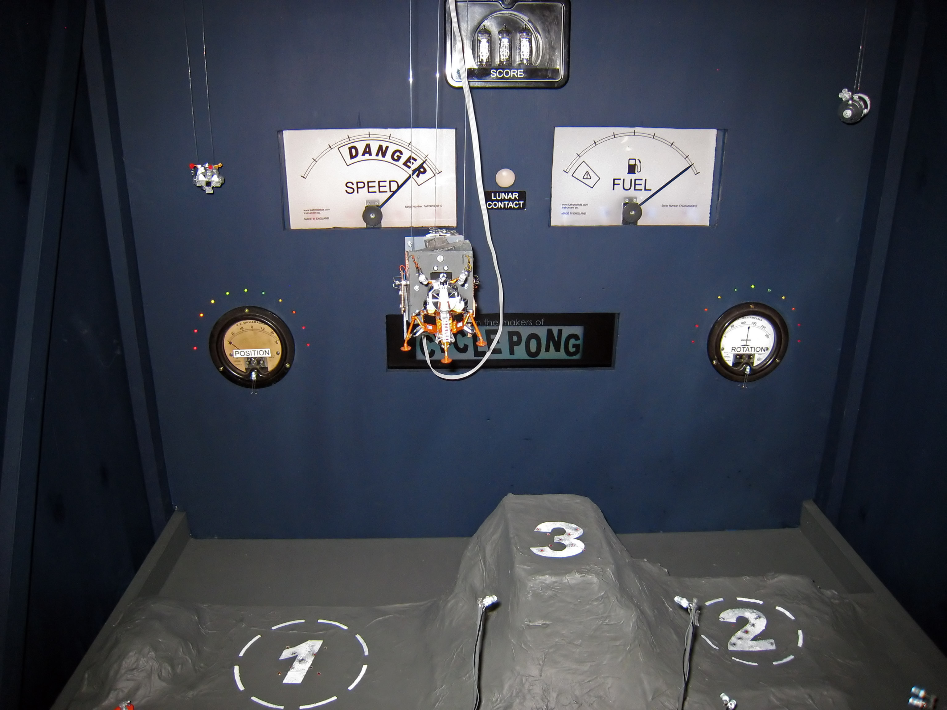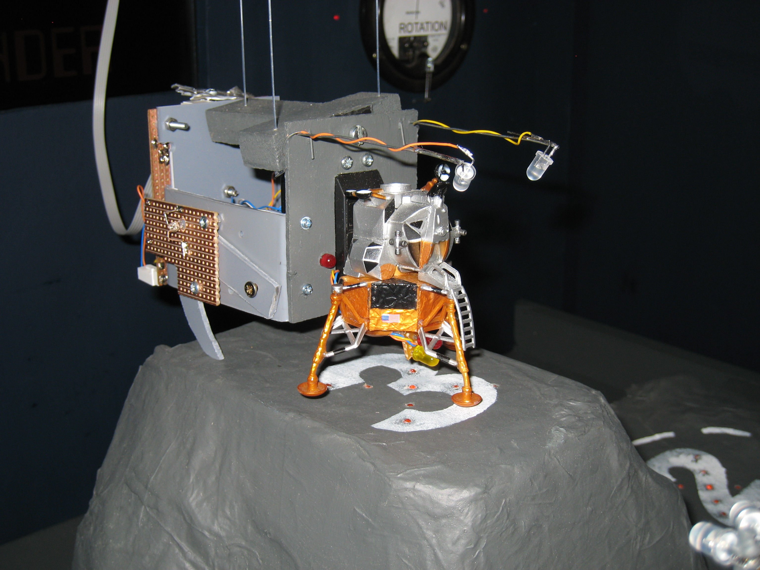 Replacing Atari's vector graphics, my Lunar Lander is a model that hangs on fishing line and flys over a paper mache landscape. Stepper motors provide accurate control of the position and a servo controls the rotation.  I won't claim the beautiful model making achieved by Thunderbirds, but the space-age look and visible wires certainly give it something of that feeling.