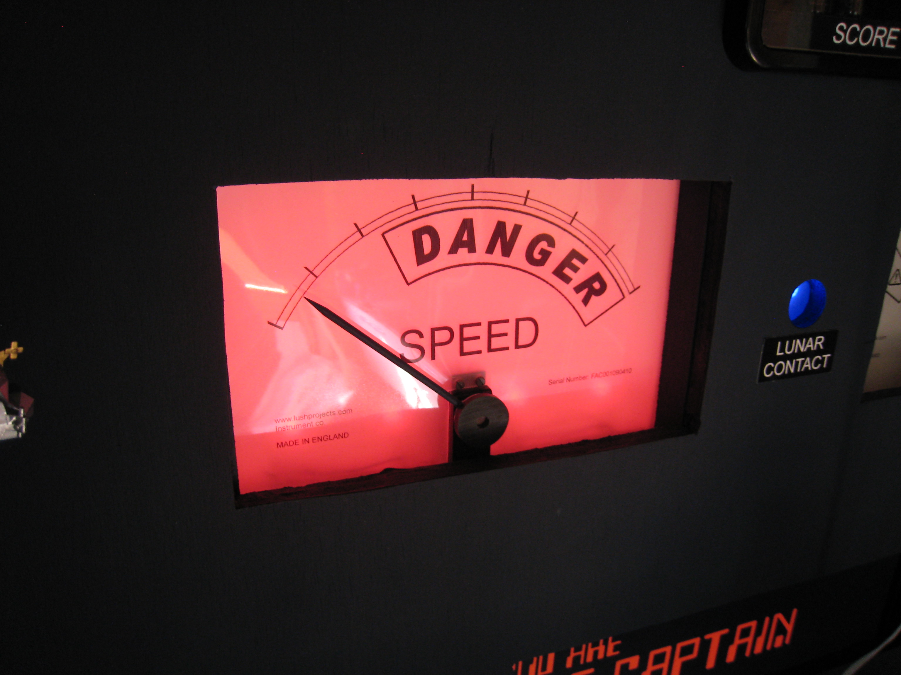 Big dials (controlled by more servo motors) show the speed and fuel. These are backlit with LEDs that change colour when in the critical zone. Matching 'vintage' meters show the position and rotation of the lander model. Adding to the historical look there is a nixie tube display for the score. Lastly I couldn't quite get away without using a monitor, so there is a small LCD which has been masked off to give it an interesting aspect-ratio.