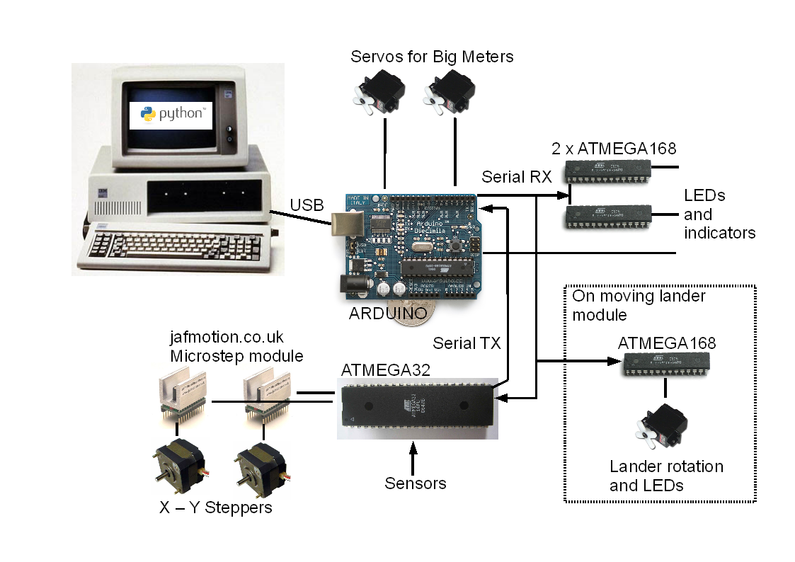 The electronics for Lunar Lander are based around ATMEL AVR microcontrollers. An Arduino board acts as a convenient USB to serial converter which makes the computer interface nice and easy. All the microcontrollers listen to a common bus from the Arduino. The circuit boards are hand-wired on stripboard or tripad except for the nixie driver which needed a PCB to make the connections to the valve base of the nixies. I was trying to make life easy for myself by using lots of off-the-shelf parts. There is some slightly clever stuff in the AVR software which makes the stepper motors run very reliably at the right speed  even if the speed is being varied during the game.