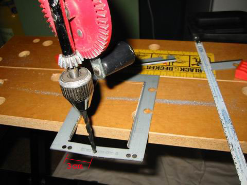 Now you need to add two holes the the bracket to allow it to sit in between the two normal mounting points. The first hole should be on the front end of the bracket 3cm in from the inner one already there as indicated on figure 3. Make this hole the same size as the pre-existing one. The second hole should be added to the bent-over end of the bracket in the same relative position to the existing hole.