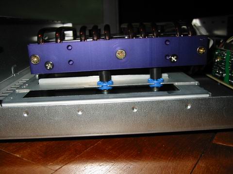 Now use a fine file to take off any rough edges and loose metal from the bracket. Reinstall the blue grommets and brass collars exactly as they were on the unmodified bracket. You now need to take the four screws that used to hold the hard disk to the bracket and cut about 3mm off the ends to make them fit in the smaller rubber feet from the Zalman kit.