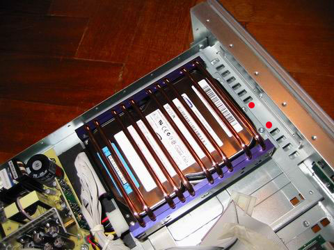 Now you are ready to install the bracket back in the Tivo. The bracket sits between the two normal disk mounting points in the Tivo and uses one fixing position from each side. Refer to figure 5. Note the position of the screws to hold the bracket in place (marked with a red dot).